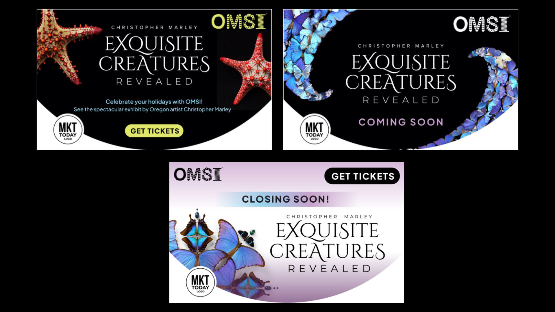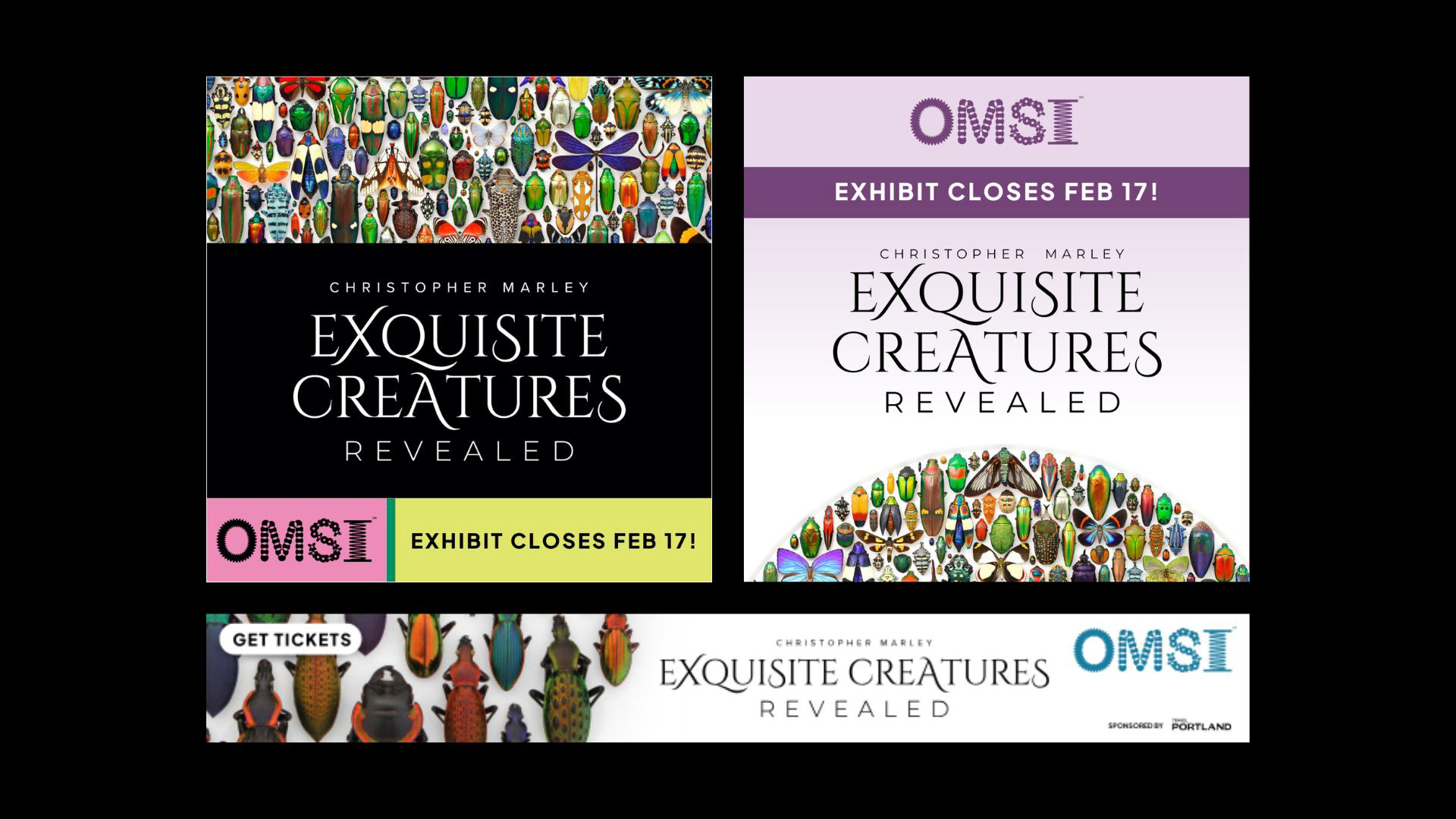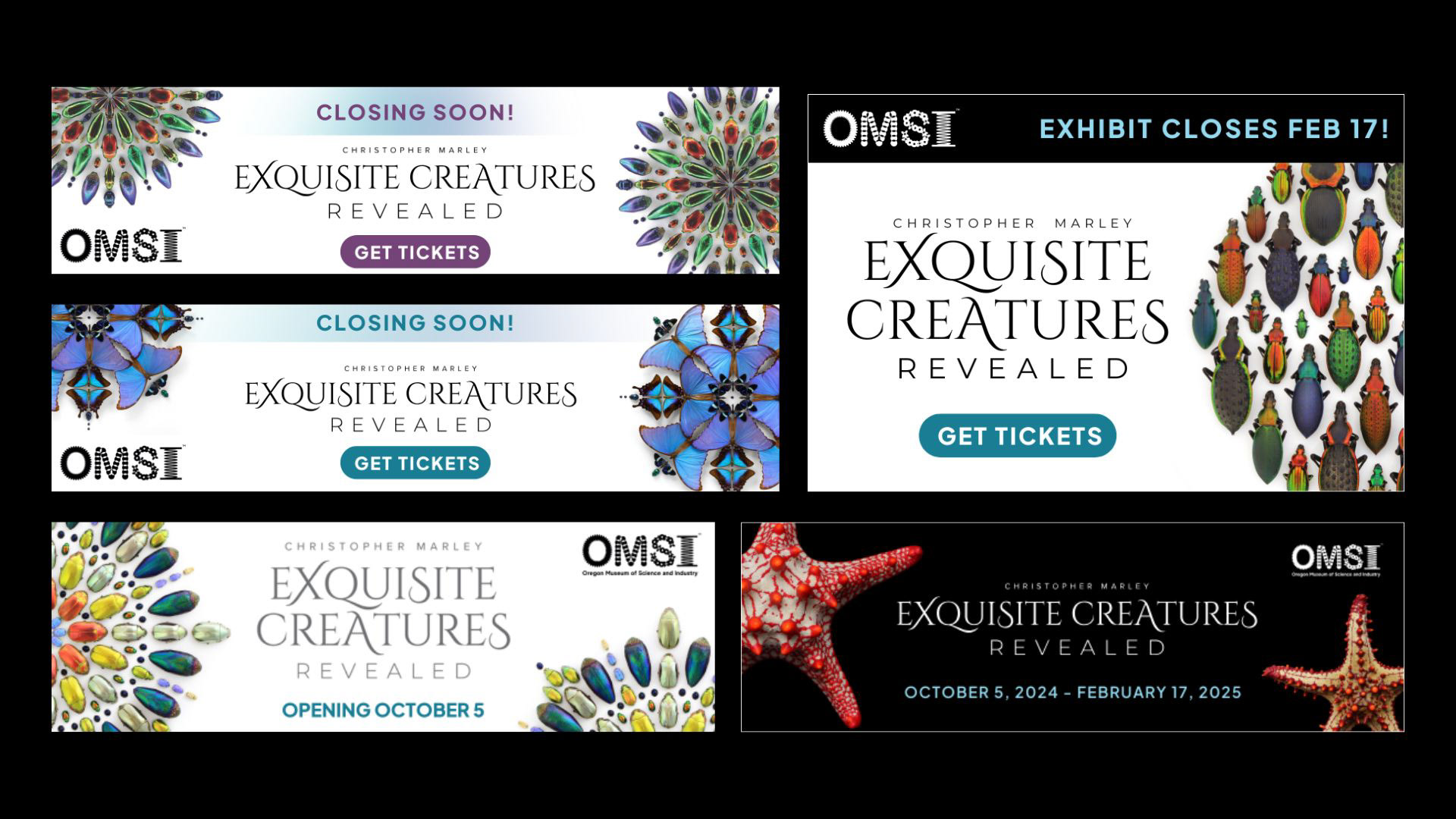 A collection of digital ads for Christopher Marley's exhibit, Exquisite Creatures Revealed. The main goal when creating these assets was maintaining fresh designs that reduce audience creative fatigue, showcase exhibit highlights, and align with Exquisite Creatures Revealed brand identity.